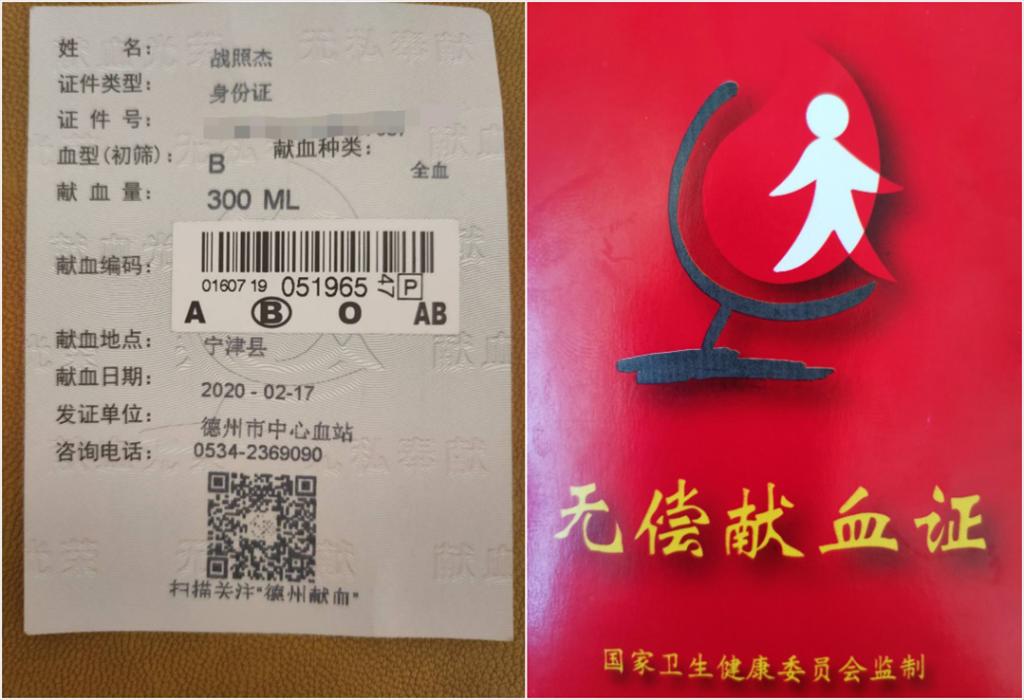 林业工程学院19级森林保护专业学生战照杰,2020年2月17日,在医院陪护生病的爷爷期间,得知当天医院抵达了一辆来自市医院的无偿献血车,一番思索之后便决意去献血。