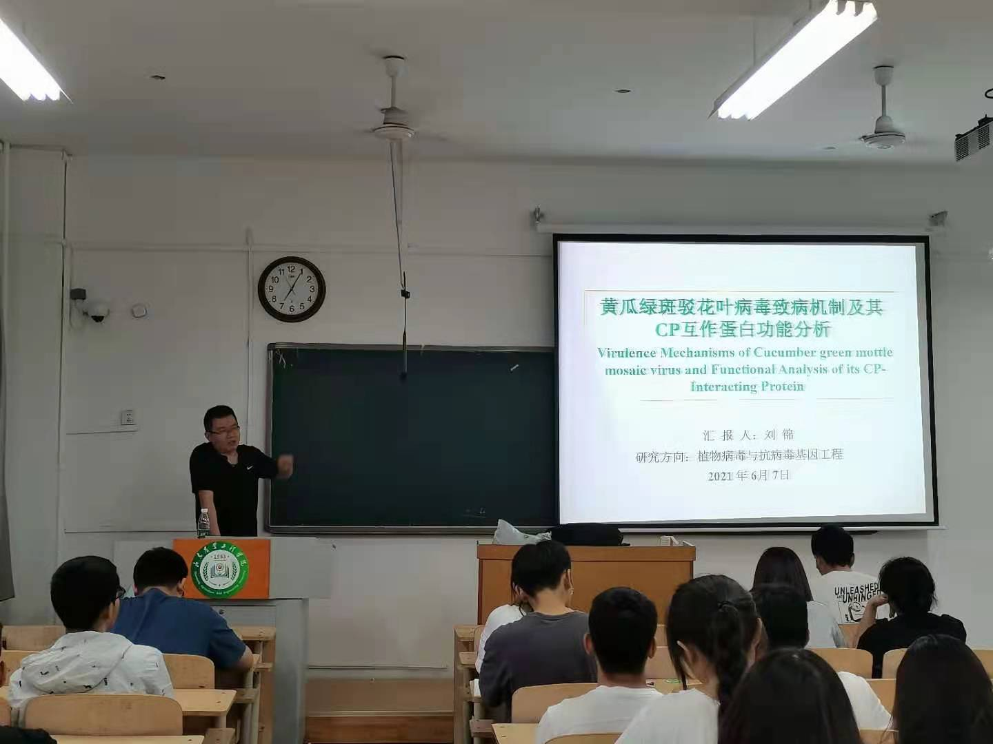 刘锦老师首先讲述了科研的基本概念和研究生与博士阶段的主要工作,激发了同学们对于科研工作的浓厚兴趣,随后,刘锦老师从研究背景、研究目的、技术路线、研究结果、研究意义、实验结论六个方面详细地介绍了斑驳花叶病毒的研究内容。报告内容以丰富的实例,专业的内容,精彩的演讲,具体介绍了斑驳花叶病毒的致病机理。刘锦老师通俗易懂的讲述使得同学们对植物病理学领域产生了极大的兴趣。此外,刘锦老师还向同学们介绍了他对黄瓜绿斑驳花叶病毒防治的发展前景的看法,也提出了现存的一些问题。最后,刘锦老师立足于本专业,分阶段为同学们解读研究工作,讲述了硕士博士研究的工作意义,并对同学们的未来规划提出了合理建议。在刘锦老师的精彩讲述和同学们的认真倾听中,本次讲座完美落幕。