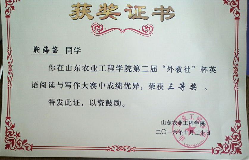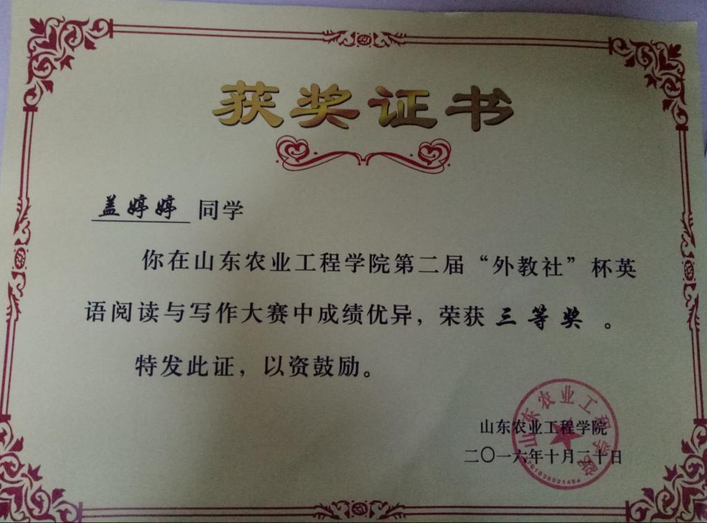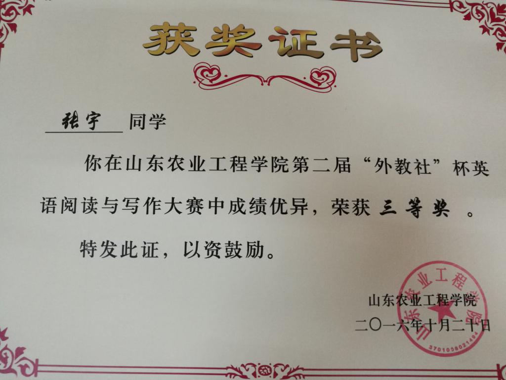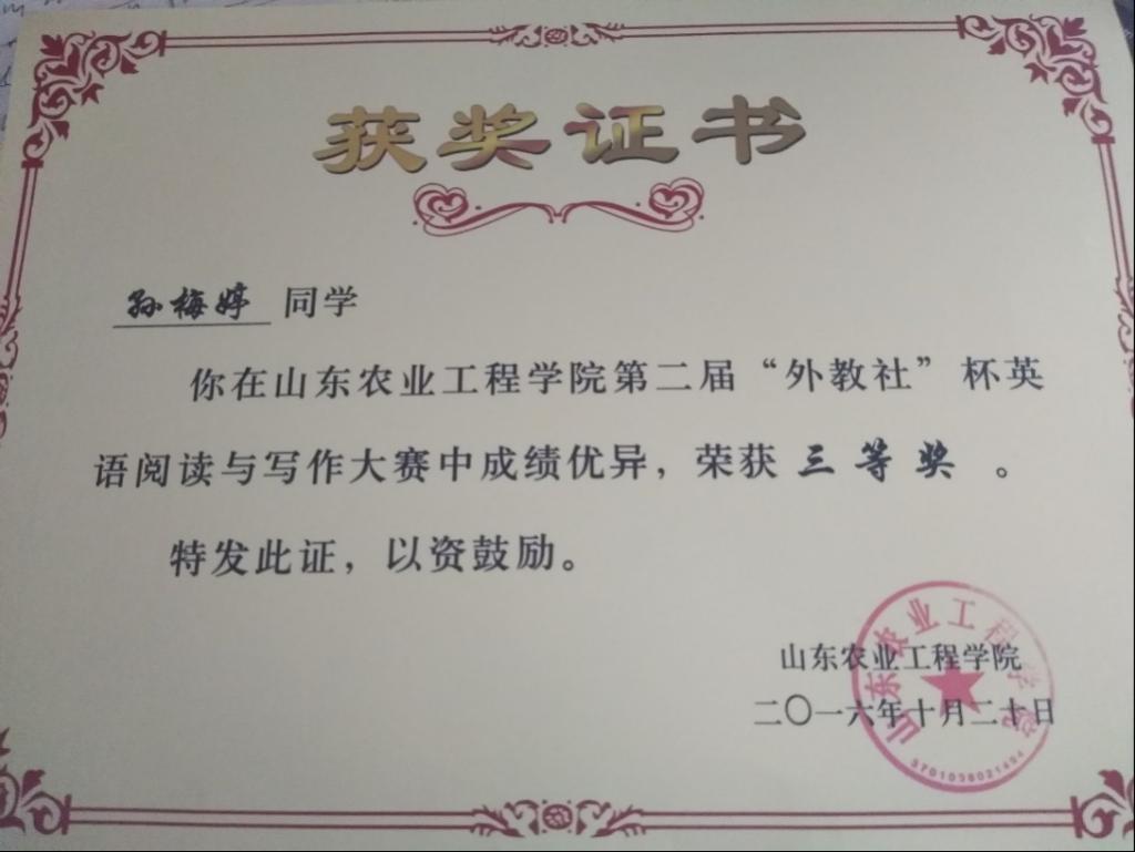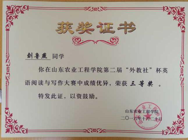 我院2016级风景园林盖婷婷、靳海笛、刘鲁燕、孙梅婷、孙希辉、汤娜文、王玉琪、吴晓雪、张宇等9名同学在今年会官方网站第二届“外教社”杯英语阅读与写作大赛中,成绩优异,荣获“三等奖”。
