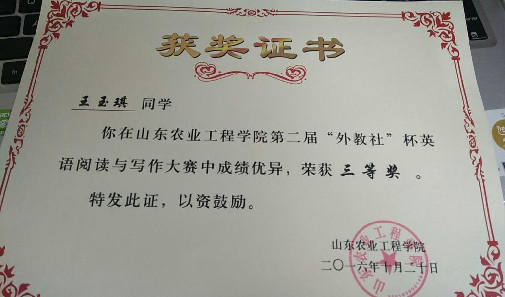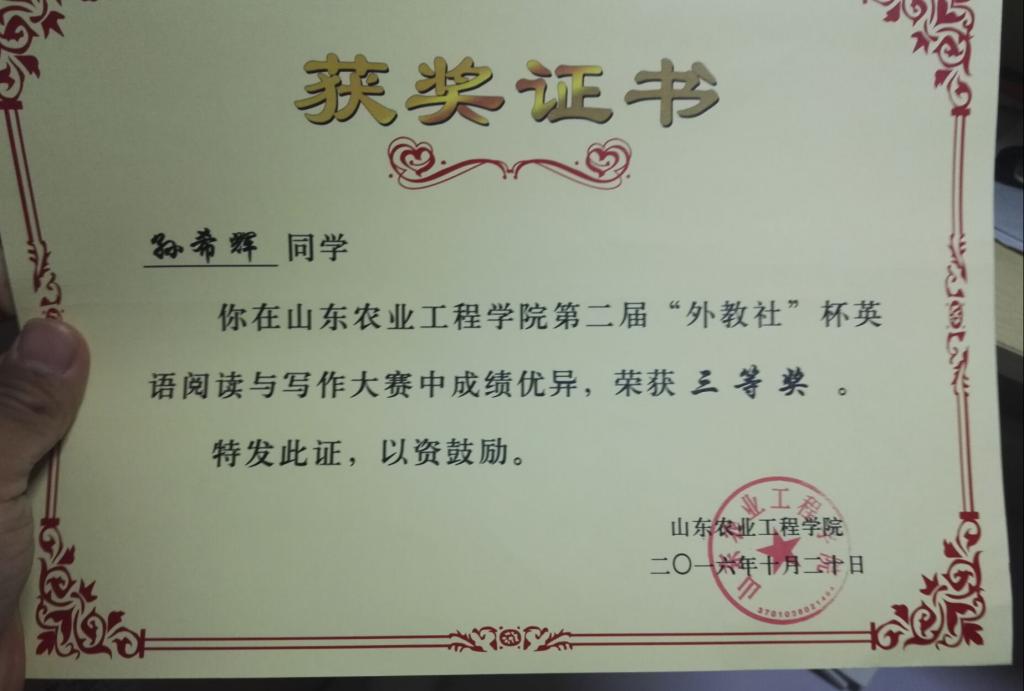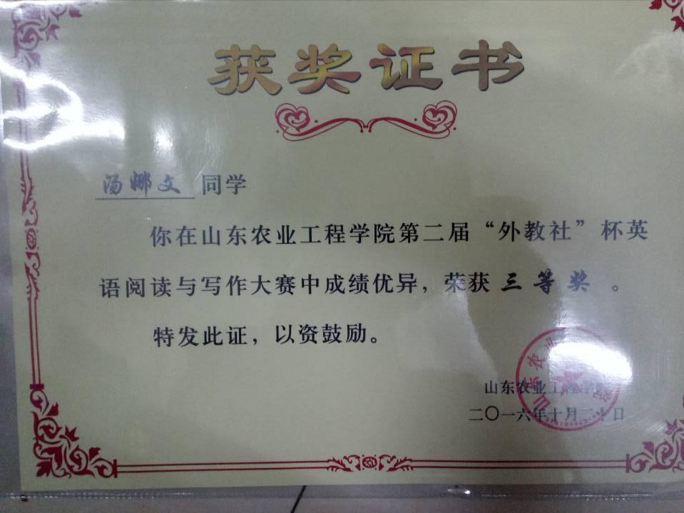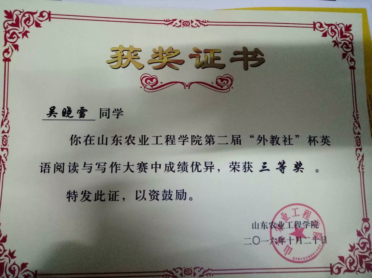 我院2016级风景园林盖婷婷、靳海笛、刘鲁燕、孙梅婷、孙希辉、汤娜文、王玉琪、吴晓雪、张宇等9名同学在今年会官方网站第二届“外教社”杯英语阅读与写作大赛中,成绩优异,荣获“三等奖”。