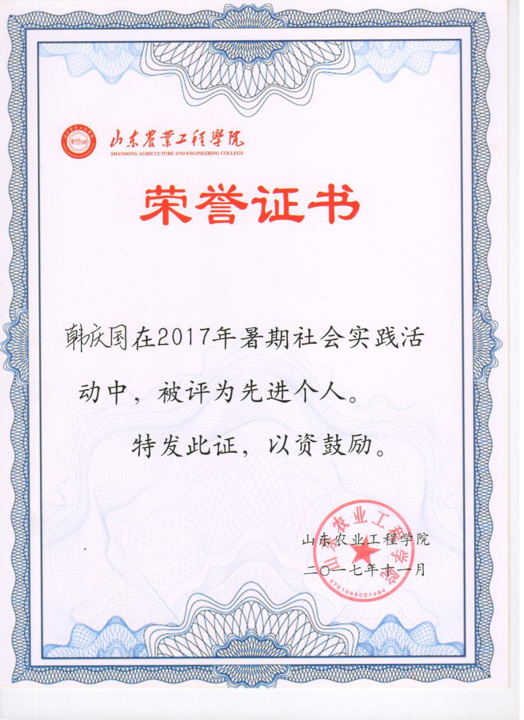 2016级园林技术(校企)韩庆国、2016级风景园林专业黄泓霖、2016级风景园林王欢,在2017年年暑期社会实践活动中,被评为先进个人。其中王欢的《赴山东省各地科技支农报告》在2017年暑期社会实践报告评比中获二等奖。