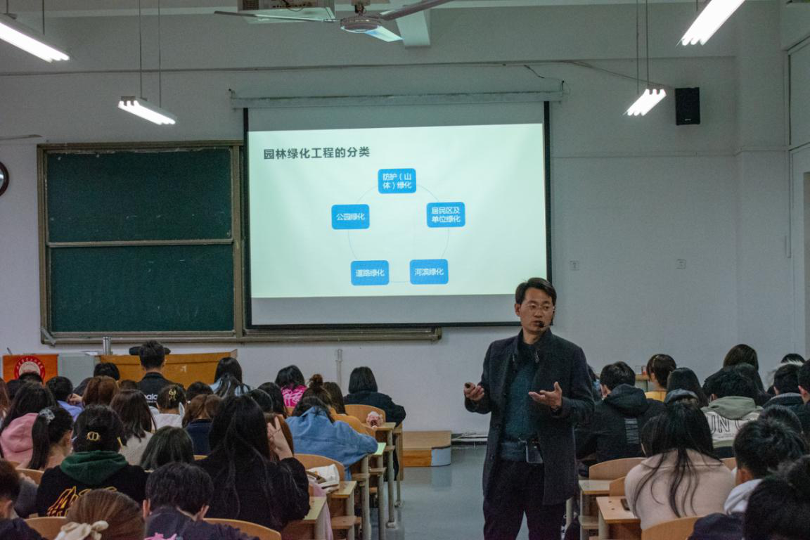 本次学术讲座,张忠峰博士重点介绍了园林绿化工程发展现状、施工流程质量控制及检验、园林绿化工程分类,既有理论分析,又有实践探索,还有自己的独到见解,思路清晰,通俗易懂。张忠峰博士绘声绘色地讲述,大大提高了同学们对于园林绿化工程的兴趣。此外,张忠峰博士还向同学们介绍了园林绿化植物的种植、病虫害防治以及施工准备的控制要点。讲座过程中,同学们聚精会神、认真思考,积极回答张忠峰博士提出的问题,讲座气氛十分热烈。通过聆听讲座,同学们对园林绿化工程有了深刻的认识,对自己未来的就业选择有了初步定位和思考。