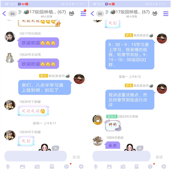 (2)平台在线服务稳定,课堂播放课件、动画顺畅,通过QQ群分享屏幕教学+互动交流方式授课进展顺利。课堂上师生之间可以互动交流,通过语音实时开展提问、答疑、点名等教学活动。