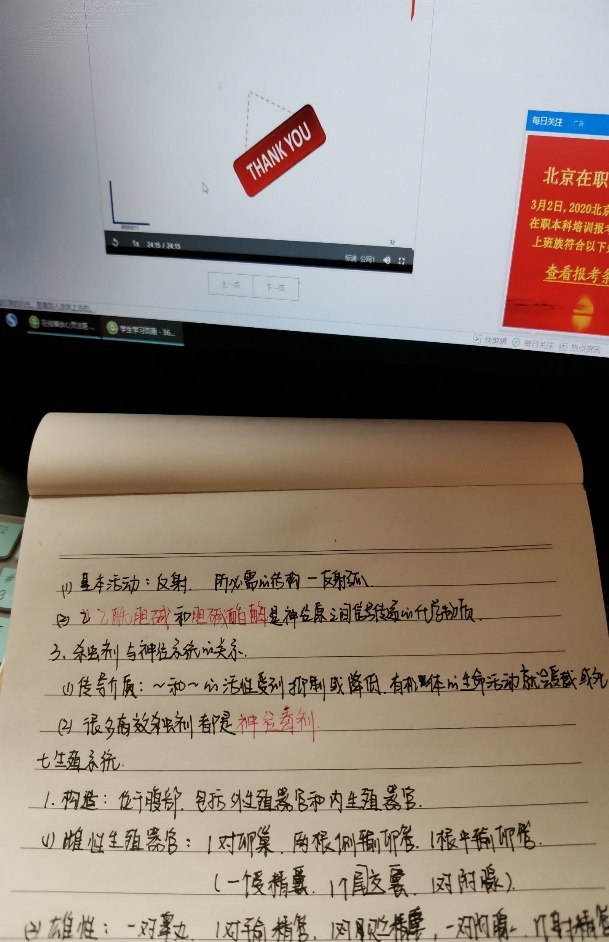近两周的网络教学,绝大多数同学能够积极主动去学,老师课上随机提问时,学生回答问题快速准确;大部分学生的笔记记得也很详细认真,对于一些不懂的知识点课下也积极地请教老师。,主要优点是所有人都能看得见,还有回放功能,对于不懂的地方可以反复重复看。不足之处可能就是偶尔网络卡顿,在高峰期有些同学反映需要多次尝试才能进入课堂;再就是有些同学家里学习环境不如学校。