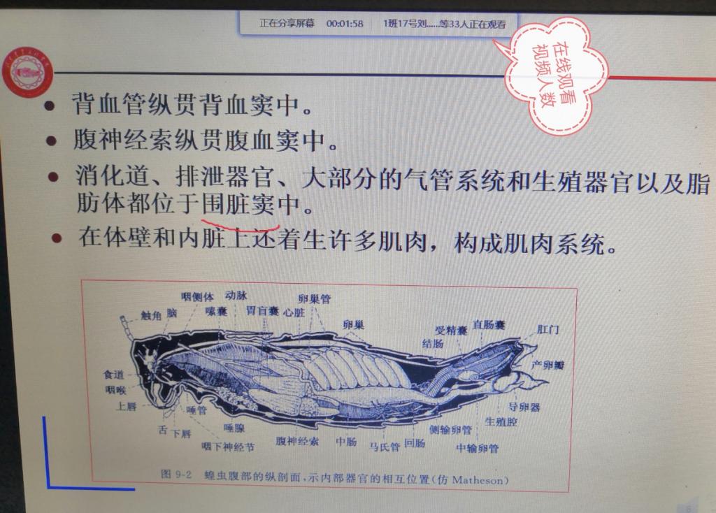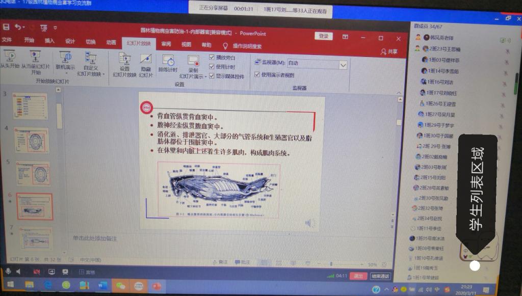 授课展示区域,用于展示授课主要内容,建议师生采用PC电脑端。考虑到部分学生用手机听课,PPT字体不宜过小。 屏幕上方显示在线课堂实时人数,若学生人数不足,可通过学生列表区域查看旷课学生。