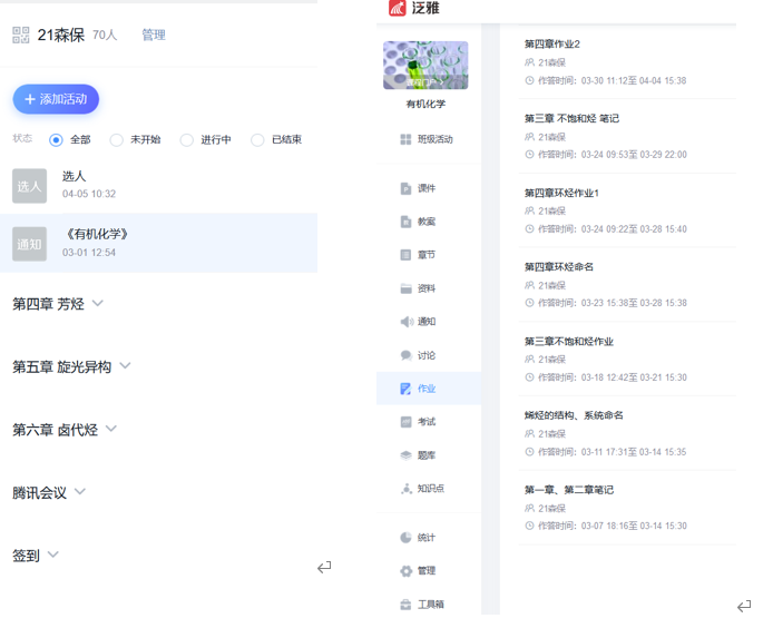 1.在学习通建立《有机化学》课程,邀请全部同学进入。并通过学习通上传教学用PPT供学生课后复习使用,发起腾讯会议直播,发布随堂练习题,选人回答问题,布置课后作业等。