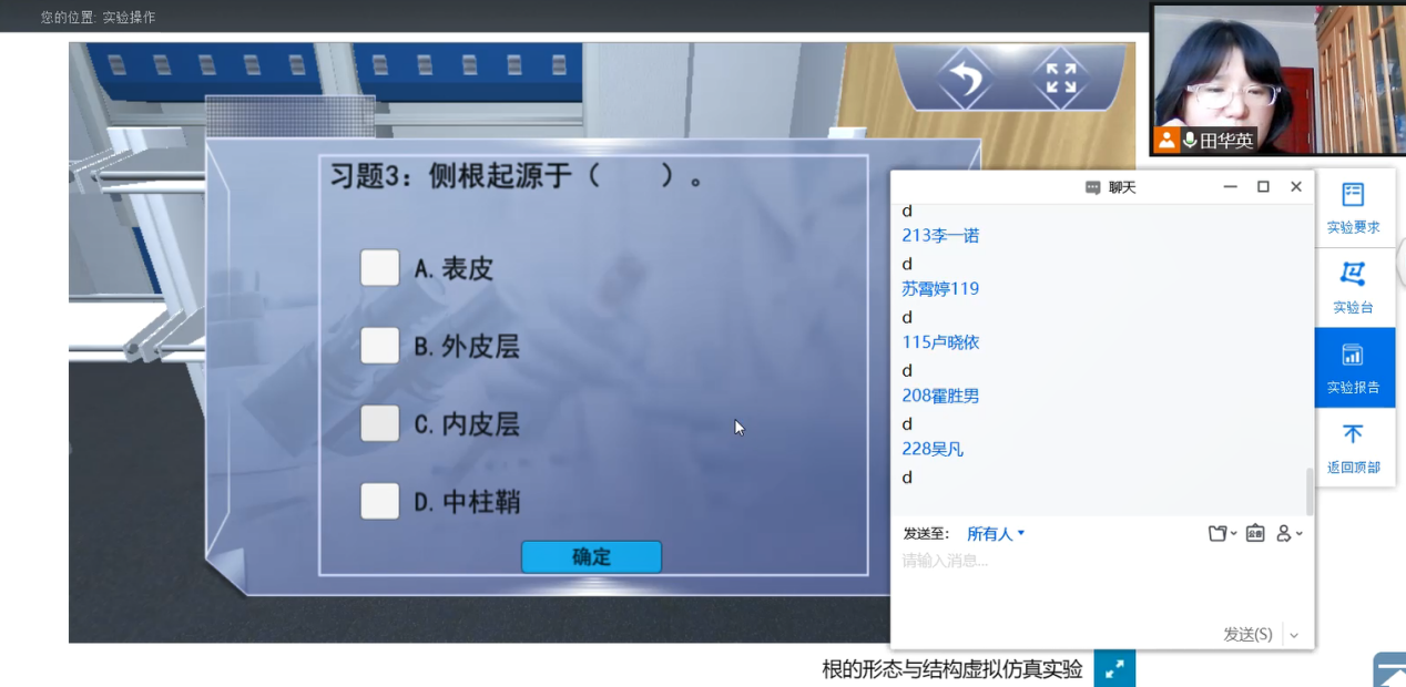 (1)直播 直播中采用启发式、探究式和讨论式的教学方法。合理设计任务点,引导学生思考;采用多样化的互动形式,不定时开展选人提问、抢答、答疑、分组讨论、投票、主题讨论等方式实现“教与学”实时互动,避免学生分神或离开课堂,提高教学效果。并且结合“实验空间-国家虚拟仿真实验教学项目共享服务平台”中内蒙古农业大学的根的形态与结构虚拟仿真实验,带领学生身临其境的进行实验操作,增加学生的学习兴趣,进一步掌握所学的内容。