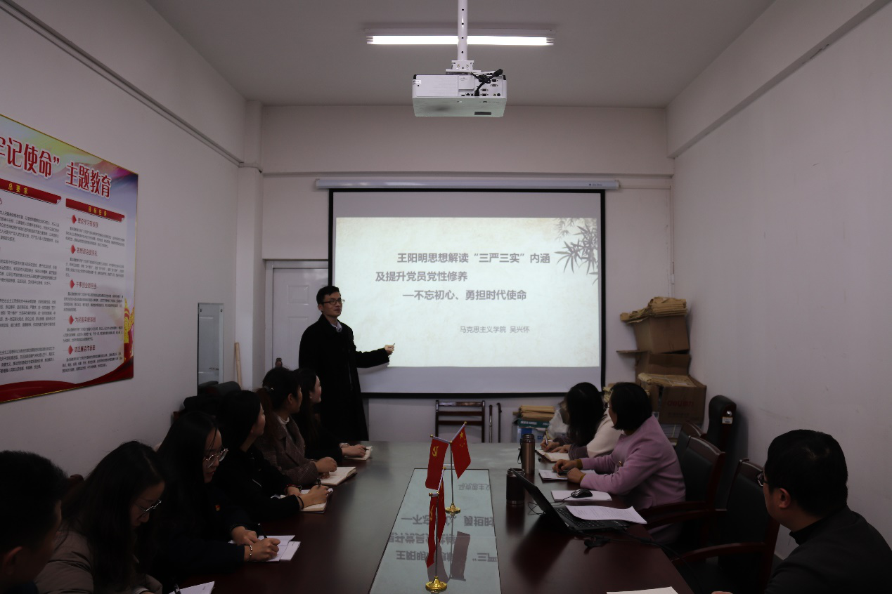 根据学校“不忘初心、牢记使命”主题教育领导小组安排,11月14日下午在2号教学楼406室,我院副院长吴兴怀同志以《王阳明思想解读“三严三实”内涵及提升党员党性修养—不忘初心,勇担时代使命》为题,为我院全体党员讲授了一堂精彩的党课。