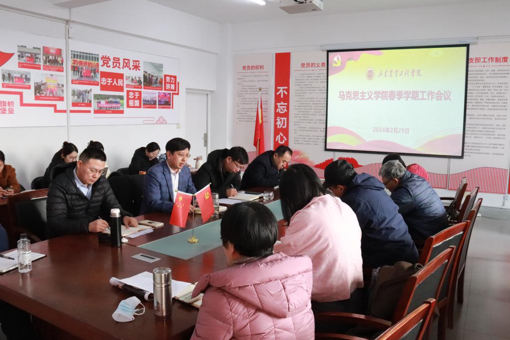 2月29日,学院在2教309会议室召开2024年春季学期工作会议,研究部署新学期重点工作,会议由学院党总支副书记刘效楠主持,党总支书记、院长周安忠,副院长段长元和全体教师参加会议。