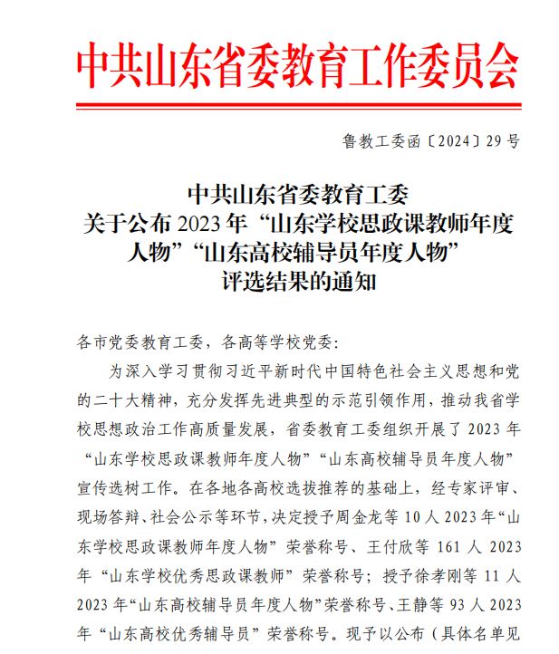 据悉,为深入学习贯彻习近平新时代中国特色社会主义思想和党的二十大精神,充分发挥先进典型的示范引领作用,推动学校思想政治工作高质量发展,省委教育工委组织开展2023年“山东学校思政课教师年度人物”宣传选树工作。经学校推荐、材料审核、专家评审、公示等环节,共161名思政课教师获“山东学校优秀思政课教师”荣誉称号。