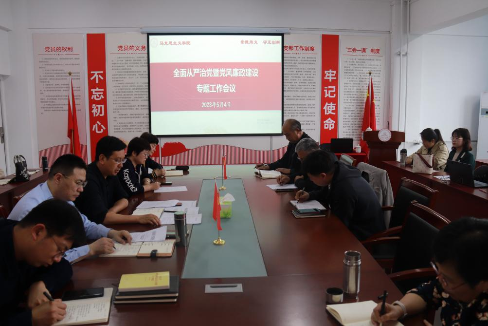 会议传达了学校党委4月26日召开的全面从严治党工作会议精神,集体学习了学校党委印发的《2023年全面从严治党重点工作任务清单》《关于集中开展不担当不作为乱作为假作为问题专项整治方案》和学校纪委印发的《2023年度党风廉政建设重点任务清单》等文件精神,并对学院2023年全面从严治党和党风廉政建设重点工作任务做出安排部署。