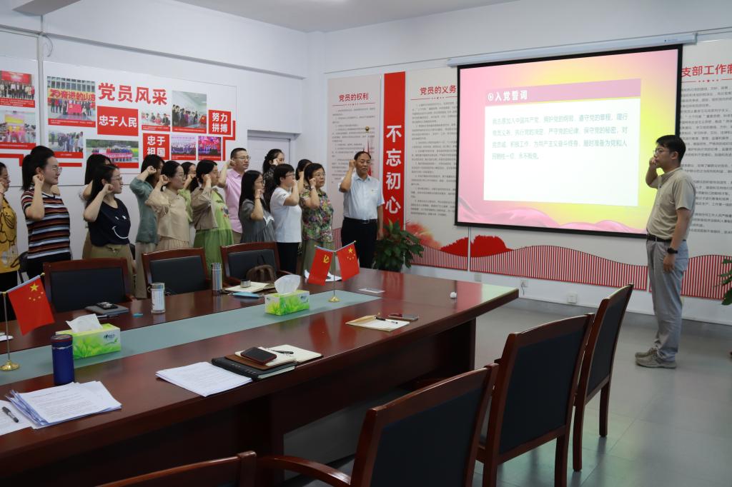 最后,全体党员面对党旗,庄严举起右手,重温入党誓词,铿锵恢宏的誓词,强烈震撼着在场的每一位党员,一字一句,神圣而豪迈,更加坚定了做好自己的本职工作,为学校、为师生奉献自我的勇气和信心。