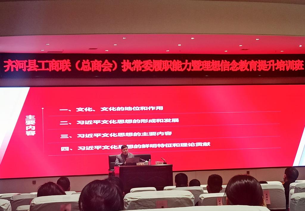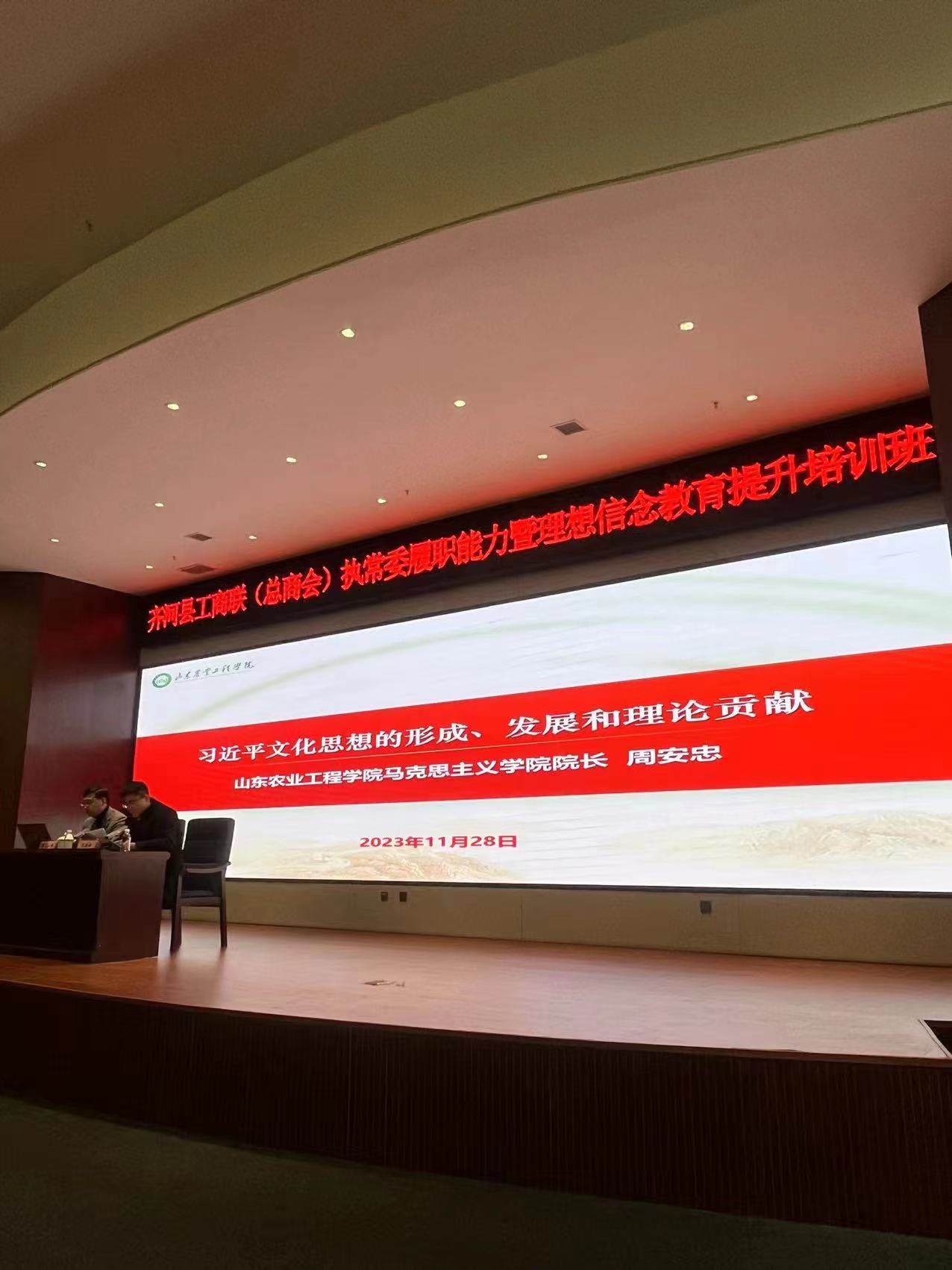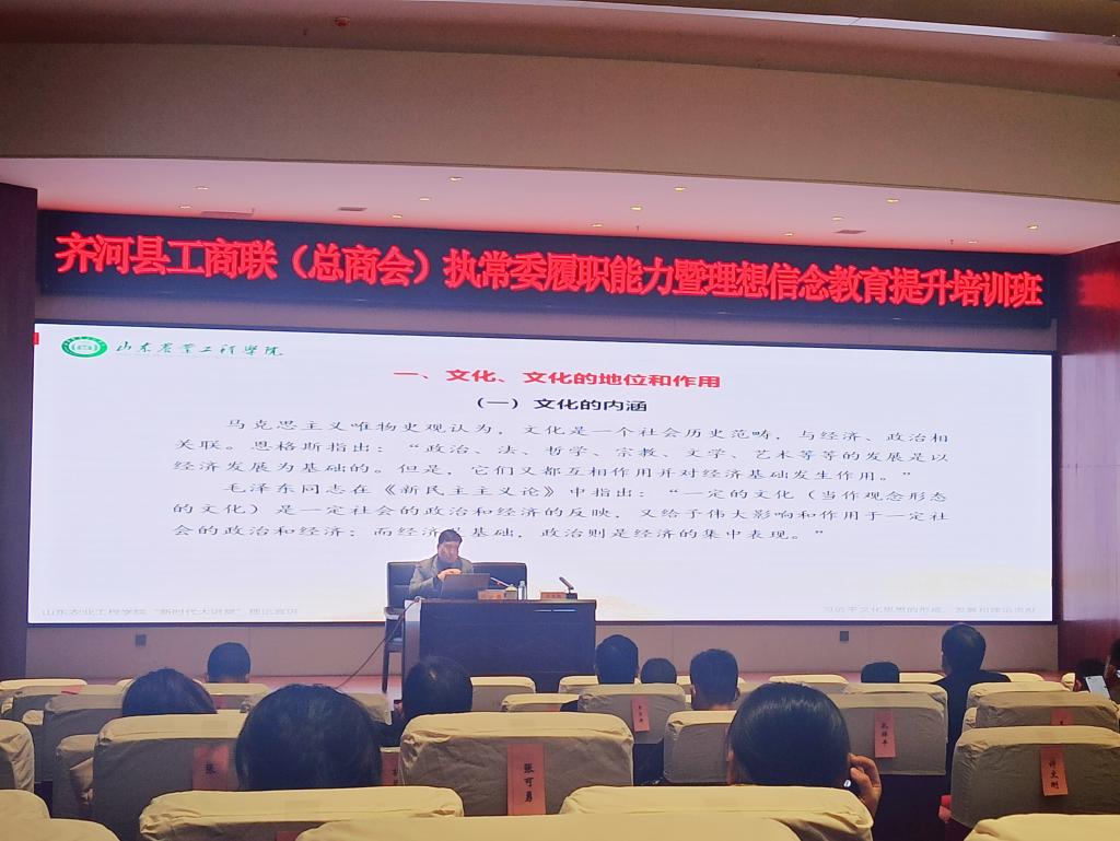 11月28日,齐河县工商联执委履职能力提升暨理想信念教育培训班在齐河县委党校举办,齐河县工商联领导和执委近百人参加培训会议。我院党总支书记、院长周安忠应邀为培训班作专题辅导报告。齐河县工商联党组成员、副主席王建新主持报告会。