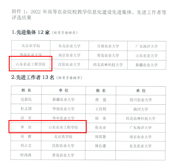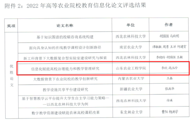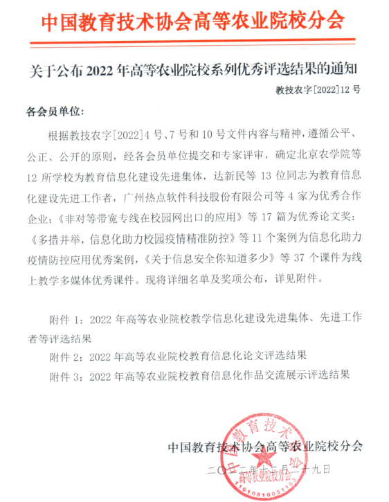 近日,中国教育技术协会高等农业院校分会公布了2022 年高等农业院校先进集体、先进个人和信息化成果系列优秀评选结果。今年会荣获教育信息化建设先进集体称号,网络信息中心主任李欣荣获教育信息化建设先进工作者,报送的“信息化赋能高校治理能力和教学管理研究”被评为优胜论文。
