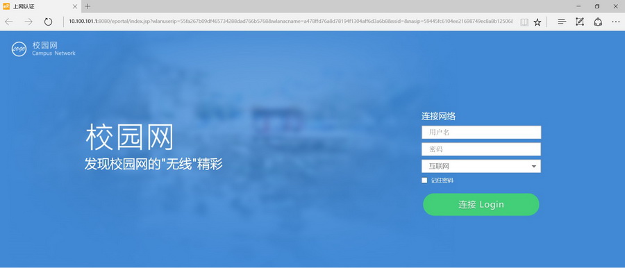 2、在弹出的校园网认证界面中输入您的用户名(OA账号)和密码,初始密码为您的身份证后六位,同时选择访问互联网,如下图: