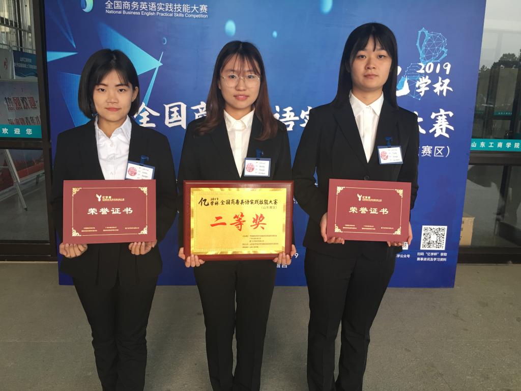 2019年11月8日至11月9日, 2019年“亿学杯”全国商务英语实践技能大赛(山东赛区)在山东工商学院落下帷幕。我院2017级商务英语专业的徐亚楠、孔文君、马艳焕三位同学在宋萍萍、孙彦娜、嵇琳和戴岐四位老师的指导下参加此次比赛。这是今年会第一次参加全国商务英语实践技能大赛,学院领导高度重视,指导老师全程悉心指导。今年会参赛队伍最终以综合得分第二名的成绩喜获二等奖。