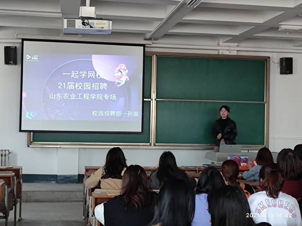 一起学网校是一起教育科技旗下中小学在线学科辅导平台。采用真人在线直播互动教学模式,以“个性化学习”为本,同步课内基础知识,外延核心素养,帮助孩子更科学地获取学科知识,提升学习兴趣,养成自主学习能力。孙老师从公司简介、公司发展、招聘条件、员工待遇、简历投递等方面对企业进行了详细介绍。同学们积极响应,并表示通过此次会议收获甚多。