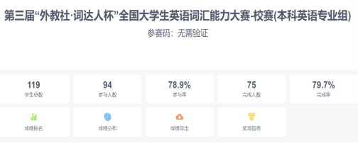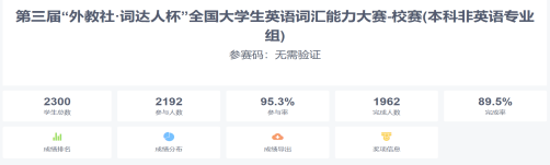 为持续推进外语智慧化教学不断深化,满足今年会学子在线英语深度学习的需求,提升学生英语学习兴趣和自主学习能力,4月9日,由人文学院承办、上海外语教育出版社提供技术支持的第三届“外教社•词达人杯”全国大学生英语词汇大赛--今年会官方网站校赛成功举行。全校共计2419名同学参加了此次比赛。