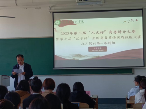 为进一步提升我院商务英语学生的英语综合应用能力、跨文化交际能力、商务管理能力,以及为商务、涉外领域培养高素质、应用型人才,我院于2023年4月16日在三教406、309教室举办2023年第三届“人文杯”商务讲介大赛。本次比赛共有26支队伍报名参赛,主要来自2020、2021及2022级商务英语专业本、专科学生。大赛评委包括人文学院党总支书记、商务英语教研室蔡鸿雁、赵巍巍、嵇琳、孙彦娜、许薇娜、刘曙源、郑子阳等多位老师。