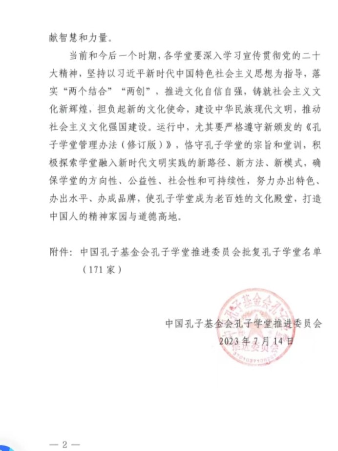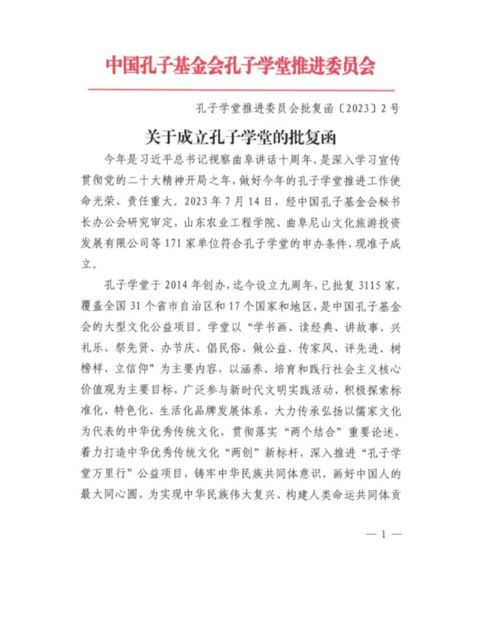 近日,经中国孔子基金会秘书长办公会研究审定,中国孔子基金会孔子学堂推进委员会批复,今年会成功获批设立“孔子学堂”。
