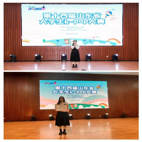 10月21日,“山东省第十四届大学生K-POP大赛”在山东师范大学举行,我院22级应用韩语专业学生王颖静在指导老师仇学的带领下,以一首韩文歌曲《惠化洞》获得小组第二名,荣获优秀奖。