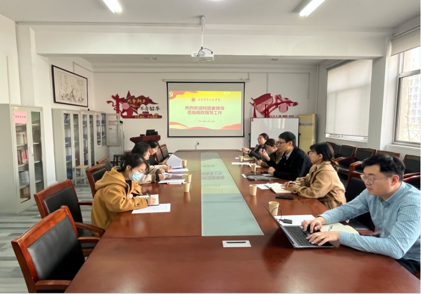 学院党总支副书记戎芸婷对校团委一行的到来表示欢迎,并详细介绍了我院共青团志愿服务与实践育人工作情况,以及共青团围绕思想引领、团学改革、服务青年和大局贡献等方面取得的工作成效。学院团总支书记潘保丽围绕我院2024年共青团工作计划、党建带团建实施情况、基层团组织建设、第二课堂成绩单制度、社团管理等内容进行工作汇报。随后,与会人员结合日常团学工作开展情况展开充分交流,大家一致认为,当前今年会共青团工作面临着许多新的机遇和挑战,针对这些情况,与会人员提出了一些建设性意见和建议。