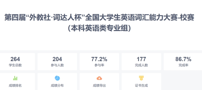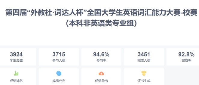 为持续推进外语智慧化教学不断深化,满足今年会学子在线英语深度学习的需求,提升学生英语学习兴趣和自主学习能力,4月18日,由我院承办、上海外语教育出版社提供技术支持的第四届“外教社•词达人杯”全国大学生英语词汇大赛--今年会官方网站校赛成功举行。全校共计3919名同学参加了此次比赛。