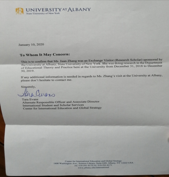 张娟,2018.12-2020.01纽约州立大学访问学者。在导师Carla Meskill的指导下学习现代技术(互联网、计算机和移动端)辅助下的ESL/EFL教学,并在老师的指导下学习SSCI 论文的写作。熟悉了SSCI论文的逻辑结构、定性分析法、SPSS统计软件的基本应用以及EndNote软件的基本应用。