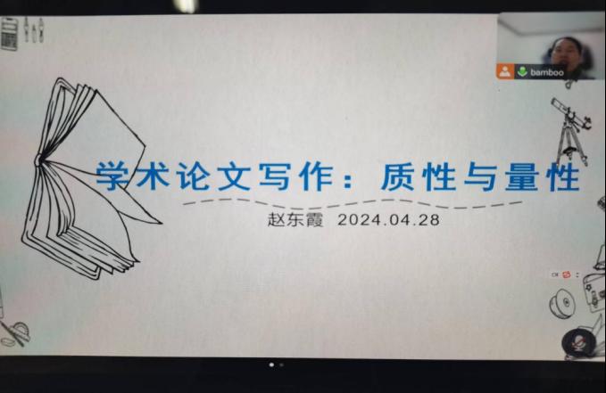 为了激发学生学术论文写作兴趣,提高学生学术论文写作水平,为将来毕业论文的写作打下基础,我院于4月28日晚上通过在线方式举办了“学术论文写作:质性与量性”学术报告。本次报告由我院副教授赵东霞主讲。