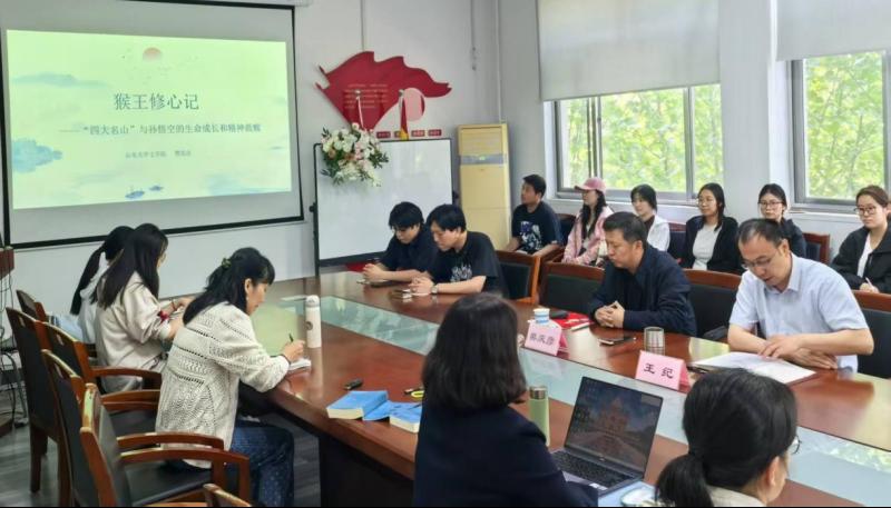 4月25日下午,山东大学文学院副院长樊庆彦教授应邀做客“明德讲堂”,做了题为“猴王修心记——‘四大名山’与孙悟空的生命成长和精神救赎”的学术报告,并与师生进行了座谈交流。本次报告由人文学院党总支书记王纪主持,人文学院部分教师及24级秘书学专业部分同学参加了此次报告。