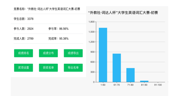为了确保竞赛的公平、公正、顺利进行,人文学院赛前举行了线上模拟。5月7日下午16:00分,在线比赛拉开帷幕,赛题以四级核心词汇为基础,全面考察高频词汇的词义、用法与短语搭配,灵活多样的题型激发了学生英语学习的热情。在一个小时的比赛时间里,同学们在“云端”争分夺秒,激烈比拼,不断刷新比赛的最好成绩,最终有2789名同学完成了竞赛。
