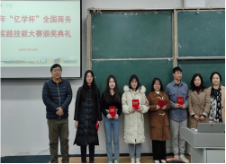 2021年12月8日晚上6点,商务英语教研室在东餐厅301教室召开了2021年"亿学杯"全国商务英语实践技能大赛颁奖典礼活动。商务英语教研室主任王潇、商务英语教研室副主任嵇琳老师以及张娟老师、赵巍巍老师、魏芳老师、戴岐老师、许薇娜老师出席了颁奖仪式。