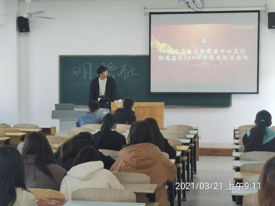 2021年3月21日,为庆祝建党一百周年,提升入党积极分子思想素质,在党总支统一安排下,党总支副书记徐波指导人文学院思政类社团“明德社”组织入党积极分子开展了“入党积极分子学党史”活动,人文学院2018级、2019级入党积极分子上午九点踊跃参与了党史学习。