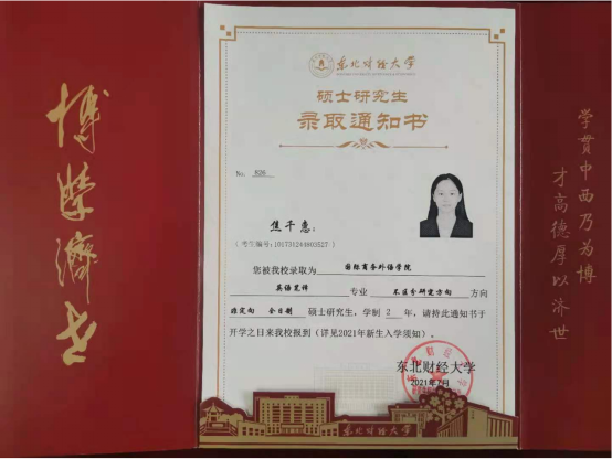 我的大学生活平平淡淡:大一时有空就泡图书馆、专业课课前预习、积极参加社团活动;大二主要是参加各种比赛和证书考试、通过不背单词APP和墨墨背单词APP记忆四六级词汇、听TED演讲+跟读、花钱报外刊精读课激励自己读外刊(满**天全额退费那种)等;大三开始为考研做准备,确定要考笔译方向,报考了翻译三级笔译,但实话说,这一年有些迷茫,不知如何着手,第二学期又遇到了疫情,只能在家上网课。但在上网课之余自己仍然坚持精读外刊整理笔记、空余之暇背单词,搜索学校信息和考研真题确定自己的目标院校。大四全身心投入考研,下学期开始考研复试、毕业论文写作还有实习,每天都安排的满满的。终于,我收到了东北财经大学英语笔译录取通知书、获得优秀毕业论文、圆满完成收获颇丰的实习。那段时间经常因各种事情熬夜到凌晨3、4点,我一直告诉自己:坚持下去。当时感觉临近崩溃的事情现在回头再看就会觉得一切都还好。不要抱怨,这一切都是最好的安排。