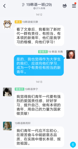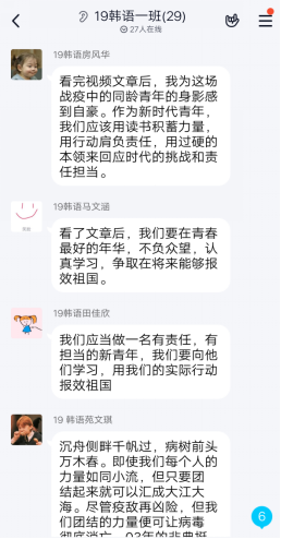 通过开展此次“共抗疫情,爱国力行”云主题班会活动,人文学院全体学生认真学习了习近平总书记给北京大学援鄂医疗队全体“90后”党员的重要回信精神,同学们坚定的表示,在党的坚强领导下,全体中国人团结奋斗、众志成城一定会打赢这场疫情防控阻击战;同学们纷纷表示,在疫情期间更加清晰地认识到党的领导是中华民族走向复兴的保证,青年人将自己的青春自觉融入到伟大建设中,祖国的明天必定更加美好!