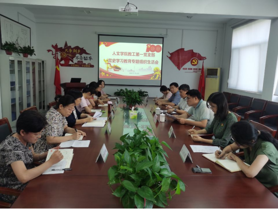 2021年7月19日,根据学校党史学习教育的安排,我院教工第一党支部于人文学院党员活动室召开了党史学习教育专题组织生活会。会议由支部书记温少梅主持,校党委组织部副部长刘庆涛、学院党总支副书记徐波到会指导。
