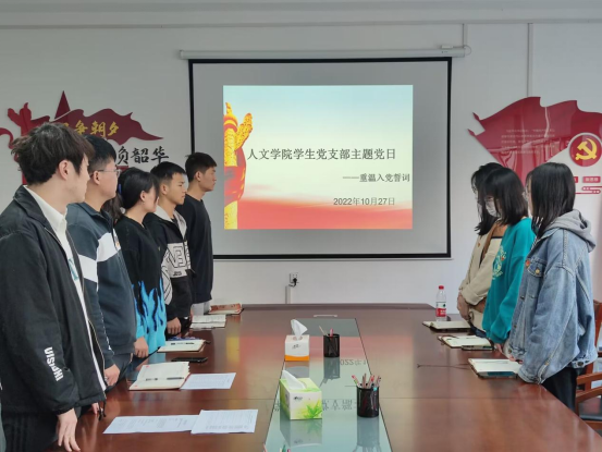 为端正党员的入党动机,并对党员做好思想教育,提高政治觉悟,人文学院学生党支部于2022年10月27日下午14时在三号教学楼205会议室开展重温入党誓词主题党日活动,人文学院学生党支部在校党员参加。