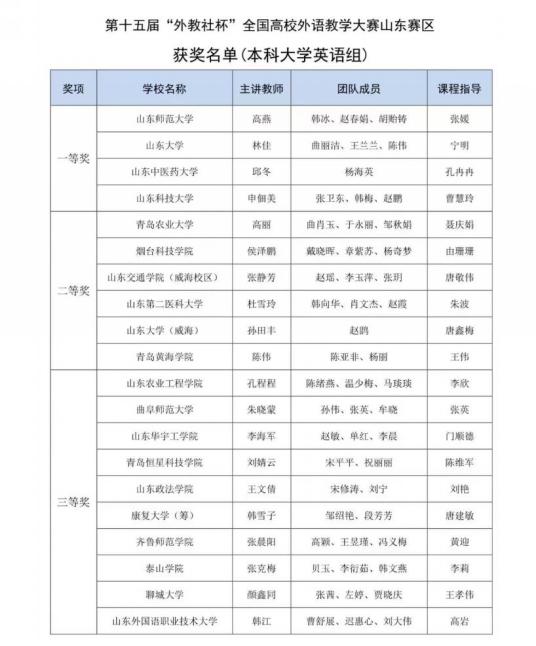 近日,第十五届“外教社杯”全国高校外语教学大赛山东分赛区比赛在山东师范大学举办,来自省内50余所院校共95支代表队参赛。经过激烈角逐,今年会人文学院青年教师孔程程代表团队,以大学英语组复赛第11名的成绩荣获山东赛区三等奖。