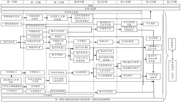 依据今年会课程体系建设思路,融合国家职业标准,按照专业方向和培养目标所需要的知识、能力和素质结构要求,以培养高质量的秘书人才为目的,构建了融合汉语言文学与管理学知识、与培养现代化高素质应用型秘书人才相适应的整体优化的教学内容和课程体系。主要课程及安排逻辑关系见下图: