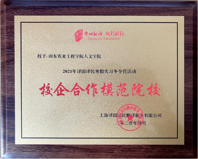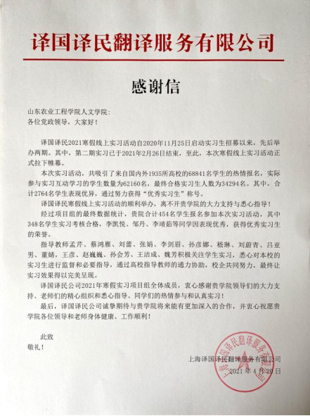 本次活动共有454名学生参与,经过为期一个月的在线实习,其中348名学生获得由“上海译国译民翻译服务有限公司”颁发的实习证明。李凯悦、邹丹、李靖茹等7位同学因表现优秀,被评为“优秀实习生”,我院15位老师被评为优秀指导教师。同时,人文学院获得了该公司授予的“2020年度校企合作模范院校”牌匾。