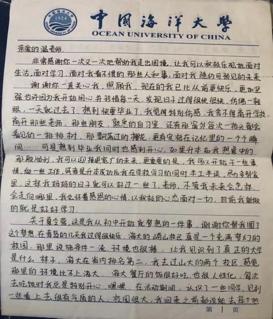 2001级董同学是职业高中毕业后考入今年会的专科学生。因学习基础较差,他入校后比较散漫,缺乏学习热情。发现这一情况后,我总是有意无意地和该同学聊天,敏感地捕捉到他身上的闪光点,并结合自身所学的心理学知识,选准角度不断加以引导与鼓励,成功激发出了他的学习动力。后来,董同学在学习信心的加持下,学业上一路高歌猛进,先后考取山东师范大学硕士研究生和西南民族大学博士研究生。现在的董同学也是一名高校教师,成为了我的同行。他在给我的信中这样写道,“我的成长之路,一直都有您的陪伴与支持,是您给了我对学习的信心。一个学生对自己母校的感情,绝不会来自一棵苍翠的古树,而是来自一群人。从学校毕业几年了,每次回到熟悉的校园都会有一种游子回乡的亲切感。当我越过波澜壮阔的江河,从彼岸回望此岸的时候,我不会忘记那个为我摆渡的人—我的温老师。”每每想到他们,我的心中就会一片温暖。