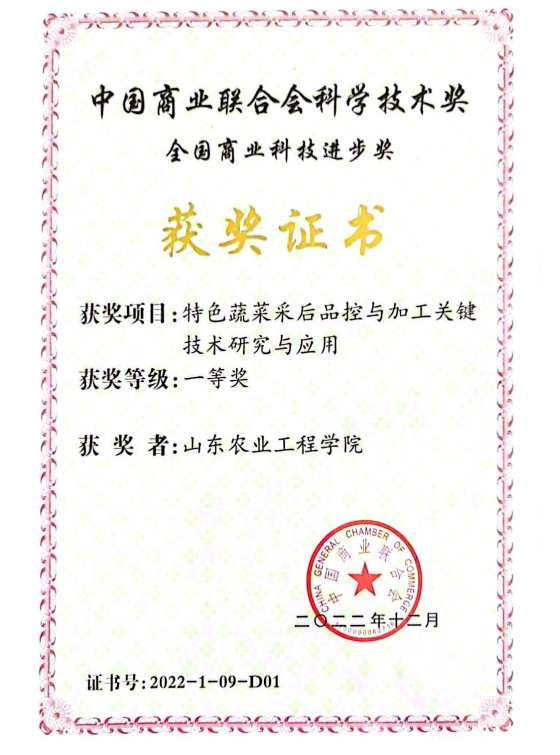 在“2022年度中国商业联合会科学技术奖”评选中,我院申报的“特色蔬菜采后品控与加工关键技术研究与应用”、“百万亩设施蔬菜提质增效关键技术集成与示范推广”项目分别获得全国商业科技进步一等奖和二等奖。