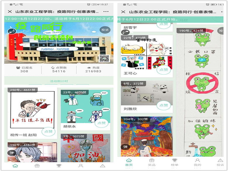 本次创新创意表情包作品评比,采取全程线上参选投票的模式,参赛作品在微信公众号食科院在线、食品科学与工程学院QQ空间等平台展示。同学们通过微信投票的方式表达对作品的支持。此次比赛累计308人报名,有效作品307份,总点赞5.4万余次,浏览人数达21.6万余人。最终食品科学与工程学院2019级牟庆庆同学以6619票高居榜首,艺术学院2019级的刘惠秋和苏航同学位列第二名与第三名。