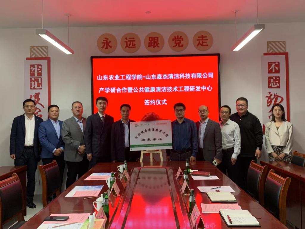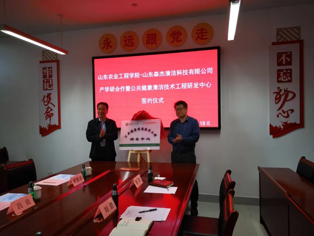 10月18日上午,我院与山东森杰清洁科技有限公司成功签署《校企产学研合作》及共建《公共健康清洁技术工程研发中心》协议,并现场进行了揭牌仪式。我院院长于克学、山东森杰清洁科技有限公司董事长吕成刚、总经理吕良、副总经理张自睿、黄敬泳、技术部经理贾万康,以及我院教师刘胜、李波、祝贺、祝梦柳等出席了签约仪式。