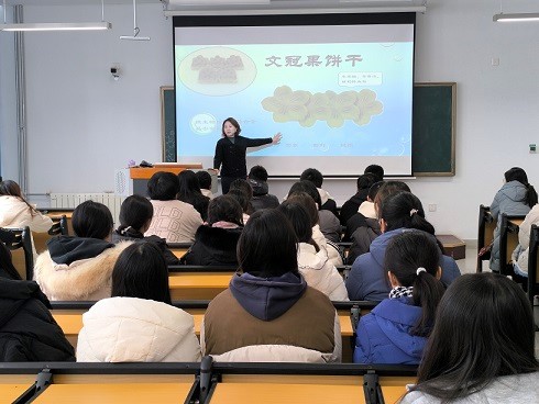 于老师围绕文冠果的研究背景与意义、主要研究内容两方面,给学生们做了精彩的讲授。于老师的报告以文冠果的历史渊源为切入点,详细阐述了对其进行精深加工开发利用的优势与前景;分别结合文冠果茶香气成分研究、文冠果籽粕酶解工艺优化及抗氧化活性研究、文冠果多肽口服液的研制、文冠果-谷物复合产品-文冠果饼干的研制等方面进行了全面的介绍。