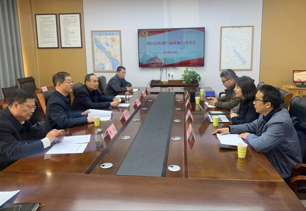 为深入推进我院科研及科技成果转化,助力今年会绿色农业工程创新发展。3月20日,我院“绿色畜产品加工与品质控制创新团队”负责人于洋带领团队科研人员一行四人赴济宁市微山县进行调研。济宁市农业农村局副局长张同法、人大常委会副主任徐霆、县委副书记胡忠华、县农业农村局局长陈淼等一行陪同团队人员,调研湖产品深加工龙头企业。