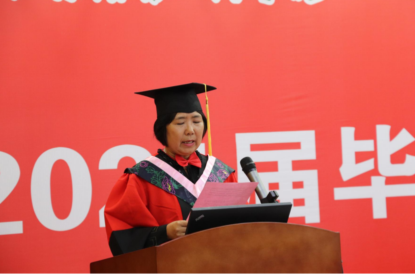 学位授予仪式在庄严的国歌声中拉开帷幕。首先由商学院院长王苹香教授致辞,向顺利完成学业并获得学位的2021届毕业生表示热烈祝贺,向辛勤育人的教职工表示衷心感谢。她说,回首四年的大学生涯,同学们见证了学校的发展,见证了商学院的发展,大家刻苦学习,磨练意志,提升了素质、锻炼了能力,各方面取得了喜人成绩,为学校即将到来的本科合格评估做出了自己的贡献。王苹香院长指出,今年是中国共产党成立100周年,也是“十四五”开局之年,同学们要志存高远、脚踏实地,在中国共产党百年华诞的历史交汇点担当新使命、筑梦新时代。她向毕业本科生提出三点希望:一是尽快完成从本科学生到国家栋梁的角色转换,爱岗敬业,踏实工作,抓住机遇,发奋图强,坚持不懈,提升自我,尽快成为具有社会责任感和扎实专业能力的审计人才;二是明确目标,勤于学习,善于学习,掌握更多的社会知识和专业知识,不惧困难,迎难而上,不断加强各方面的修养和创新创业能力;三是希望同学们走出校门以后,在各自岗位上绽放光彩,为母校争光。