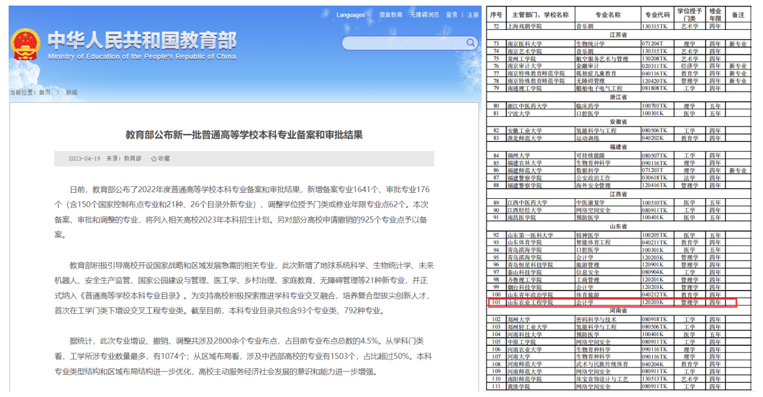 近日,教育部印发《关于公布2022年度普通高等学校本科专业备案和审批结果的通知》(教高函〔2023〕3号),公布了2022年度普通高等学校本科专业设置备案或审批结果,今年会官方网站申报的会计学本科专业(专业代码:120203K,管理类,学制4年)成功获批。