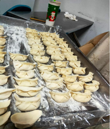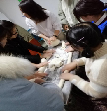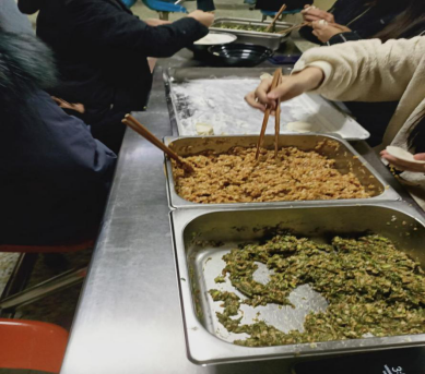 下午2时40分,按照活动安排所有成员齐聚食堂,大家都磨拳擦掌跃跃欲试。一会儿,食堂工作人员将和好的面和饺子馅端上来,大伙立即着手开始包饺子。由于人员很多,所以梵树乐队负责人先把大家分到不同的桌子,大家分头行动。