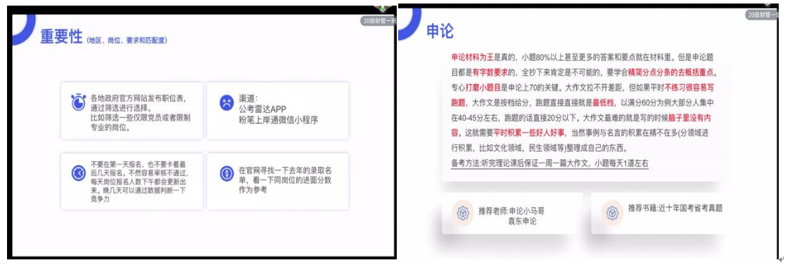 冷飞学长则主要从岗位选择和学习技巧两个方面进行了分享。他简要讲解了岗位选择的重要性,详细的介绍了各类题型的做题技巧并推荐相关老师和书籍。
